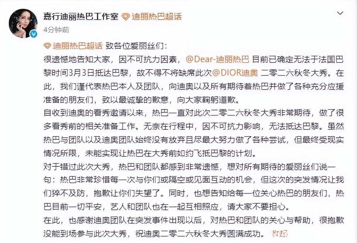 比起李茂一家的“有惊无险”,迪丽热巴那边的情况更让人揪心。从2号开始消息就断了,粉丝们在微博超话里急得直跺脚,直到3号工作室才终于冒泡回应。说是因为“不可抗力”,热巴铁定赶不上迪奥2026秋冬大秀了。其实团队这几天想破了脑袋要找路子,可谁也不敢打包票3号能飞到巴黎,这才是最让人心慌的地方。好在官方透了底,确认热巴目前人是平安的,这算是万幸。至于为啥会被困在迪拜?有大V出来扒料,说公司给热巴买的是中转票,团队反倒坐直飞。理由挺冠冕堂皇,说是中转能让艺人休息好,团队先去打点。但这说法粉丝根本不买账,大伙儿都觉得直飞才是真休息,怀疑是不是嘉行又在搞区别对待那一套。